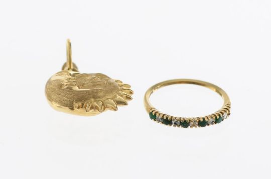 An Italian moon and sun pendant, and an 18ct gold, emerald and diamond ring