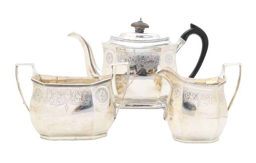 by Solomon Hougham, London 1802, comprising a teapot, on trivet, a cream jug, and twin-handled sugar bowl, of octagonal form, with later bright-cut engraved foliate decoration (4)