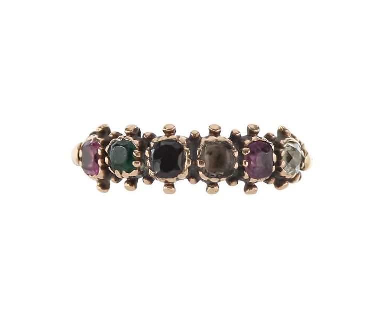 set with ruby, emerald, garnet, amethyst, ruby and diamond, bead work to setting edge, tapering bead work down each side with rope work detail to the band