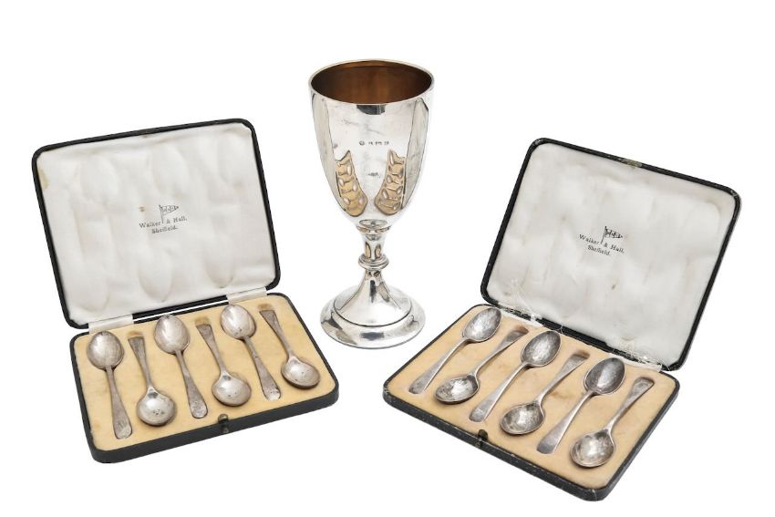 the goblet by William Hutton & Son, Birmingham 1915, of plain form, with a gilt interior, and two cased sets of six spoons, by Walker & Hall, Sheffield 1935 and 1936 (3)