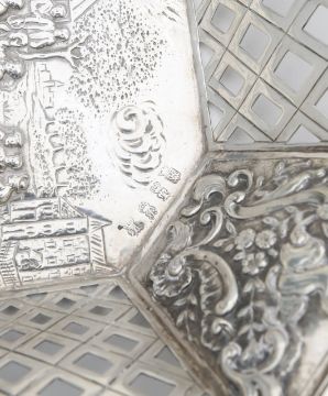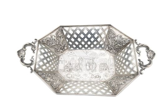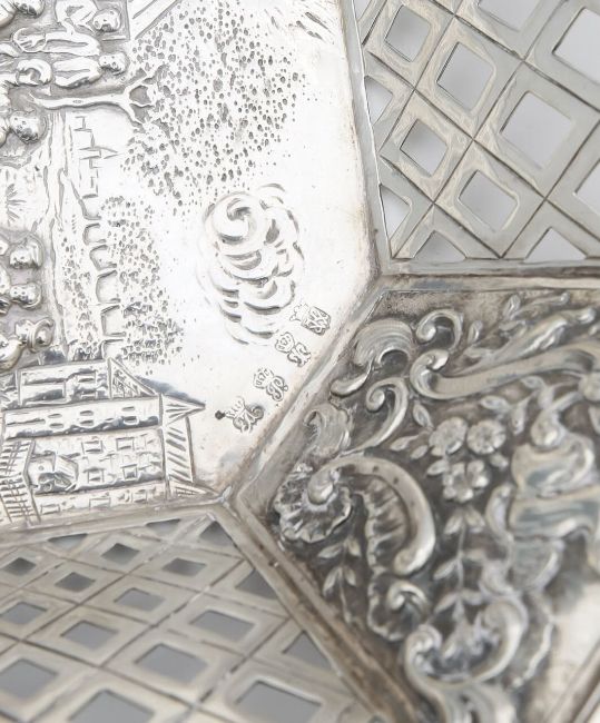 Hanau-pseudo marks for Georg Roth & Co. (1891-1919), of octagonal form, with alternating pierced and foliate repoussé sides, the base depicting a village scene with musicians playing for two dancers