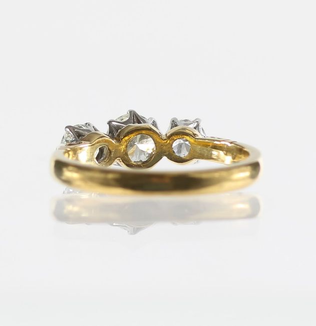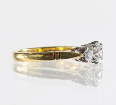 with 18ct stamp to band, three brilliant cut diamonds set in a rex claw setting mounted on a tiffany style band