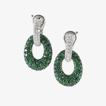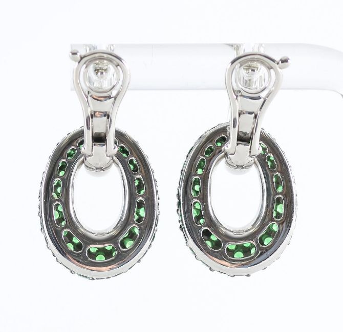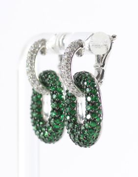 modern, comprising five row, calibrated round facet green garnets (untested) in a black rhodium hoop mount, suspended from a bombe set, three row, calibrated, round brilliant cut diamond, hoop ear ring with post and lever fittings, 750 stamp, these can be worn as separate diamond hoops and with the bottom reversed, 750 stamp to both parts