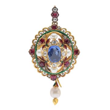 third quarter 19th century, of oval form with central cushion-shaped sapphire set within an openwork quatrefoil border of old brilliant-cut diamonds and pearls interspersed with red and green enamel leaves, set on a scalloped frame with old brilliant and rose cut diamonds and rubies, suspending a enamel, diamond and pearl drop, verbal report from GCS, London lab December 2025 stating five pearls natural saltwater and central sapphire approx. 5.4ct Sri Lanka no heat