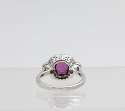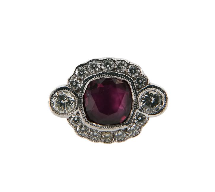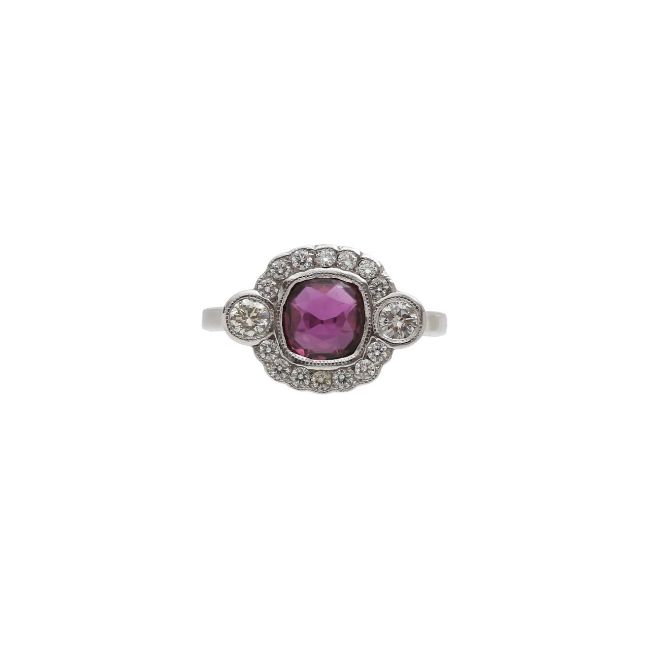 featuring a bright red natural certificated cushion cut ruby set in a flat panel surrounded by brilliant cut diamonds with milgrain detail, scalloped mount raised soft 'D' shaped band with daylights