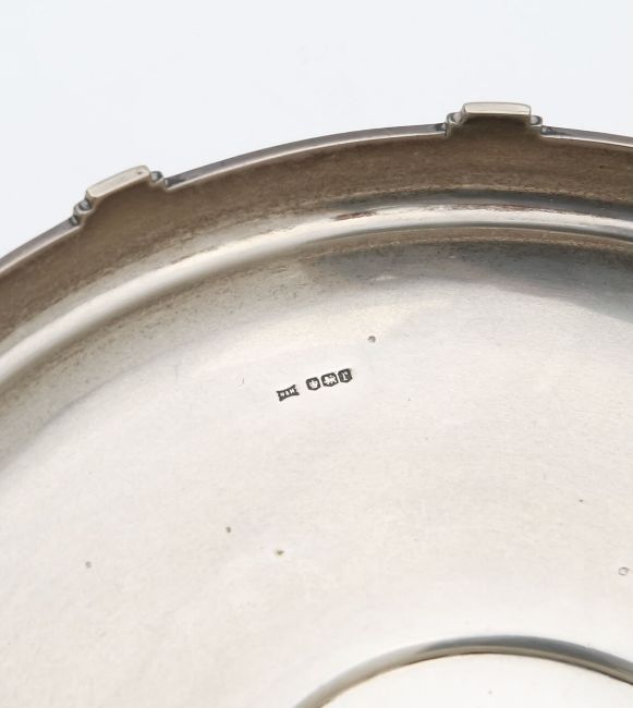 by Walker & Hall, Sheffield 1934, of circular form, with a castellated rim, raised on a pedestal base