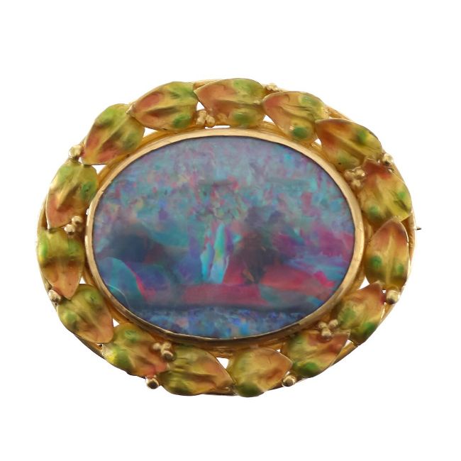 An opal and enamelled wreath brooch