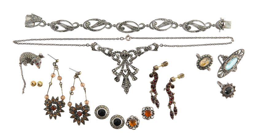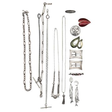 comprising a pair of opal earrings, marked 925, pair of ear clips, marked Sterling, modelled as fish, a pair of 19th century shoe buckles, two watch chains, a beaded necklace, marked 925, and six brooches, including an Austrian bar brooch, the central flower with purple gem-set petals, a small brooch inset with an orange cut stone, a circular example depicting swans in flight, a Victorian oval example engraved 'Maggie', two Norwegian guilloché enamel brooches, an unmarked seal fob pendant and gold plated cane handle (qty.)