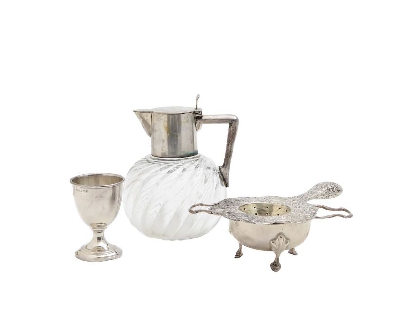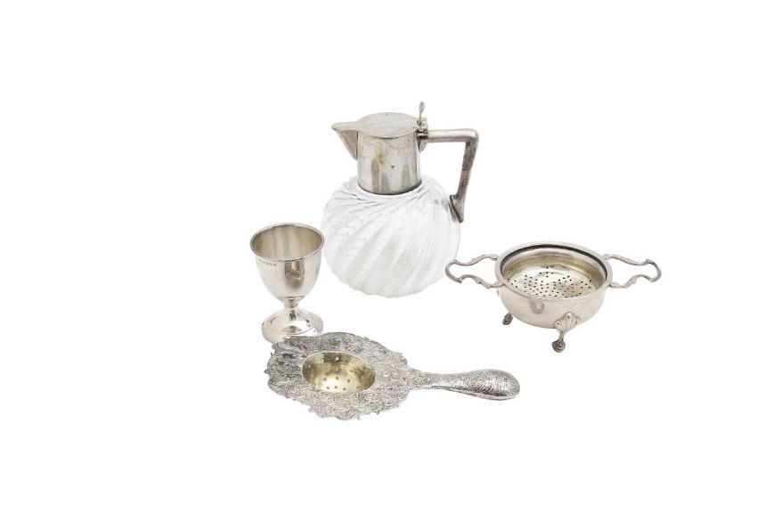 comprising a German silver mounted carafe jug, marked Hessenberg, crown and crescent moon mark, 800 standard, with a globular crystal glass body, an unmarked Continental tea strainer, decorated with figures within a garden, a Mappin & Webb tea strainer on stand, Birmingham 1943, raised on three hoof feet, and an egg cup, Birmingham 1926, engraved 'Shirley' (4)