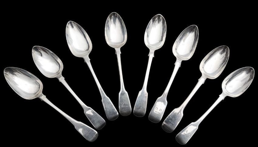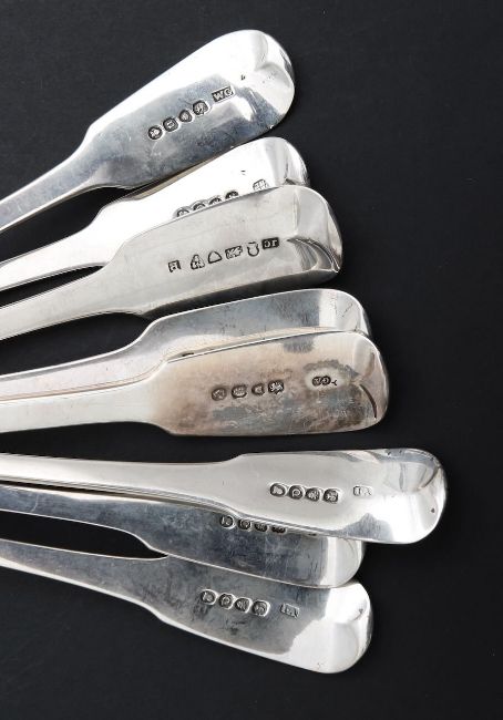 comprising a pair by John Clarke or John Coakley, Chester 1833, a pair by Joseph Ash I, London 1811, a pair by John & Henry Lias, London 1818, an example by Chawner & Co, London 1850, and another by William Chawner II, London 1828, all with later engraved initials, dated 1948-50 (8)