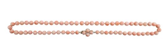 featuring a hand made coral set clasp floral design with diamond detail, strung to a round coral bead necklace individually knotted beads