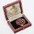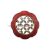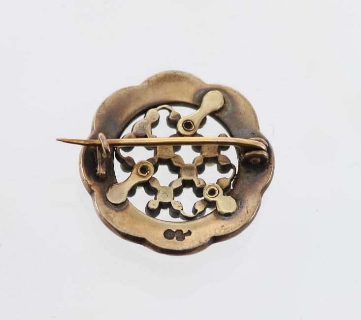 of flower shape with openwork centre with lattice pattern set with seed pearls and rose cut diamonds, with red enamel border, and makers trade mark to the reverse, in Wartski's retailers box