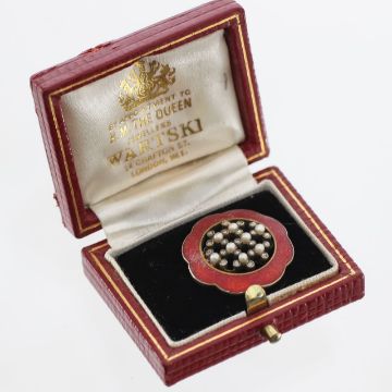 Condition: The enamel a little worn with age but not damaged as such. Otherwise in good overall condition. The enamel is a little 'sticky' to the touch. One pearl possibly replaced.