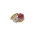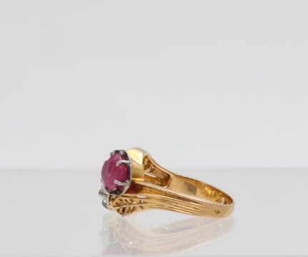 with French eagle head mark, Toi et Moi crossover ring featuring an old cut diamond and a natural pink ruby held in a claw setting mounted on a band with open work leaf design