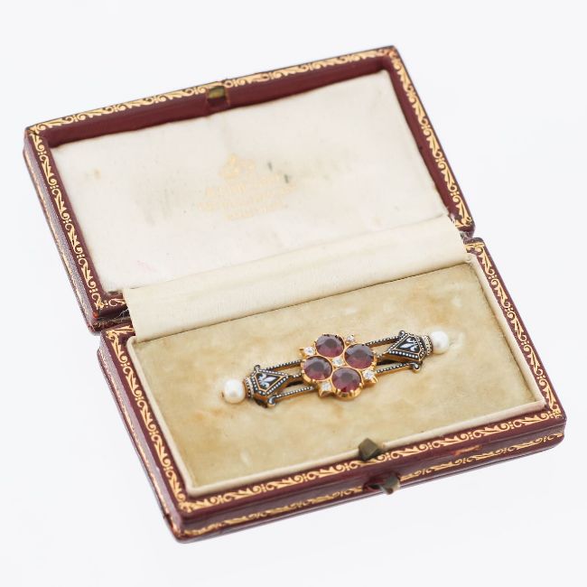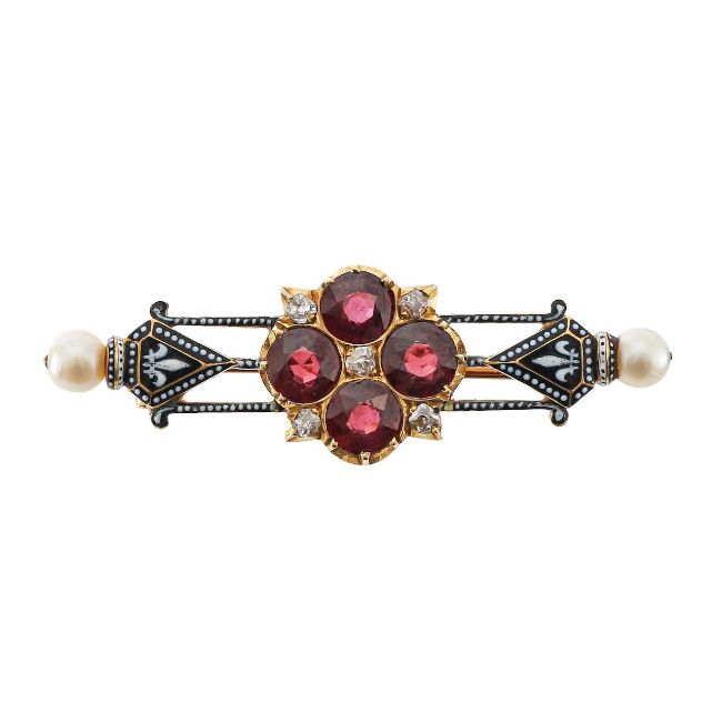 circa 1875, the open work bar brooch centrally-set with quatrefoil cluster of garnets, each separated by an old-cut diamond, to the black and white piqué enamel with fleur-de-lys design, and pearl terminals (untested), applied makers mark 'CG', with a contemporary Morocco leather and gilt tooled fitted case , the interior silk Inscribed 'C.Giuliano/ 115 Piccadilly'