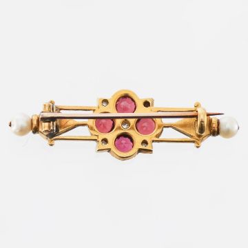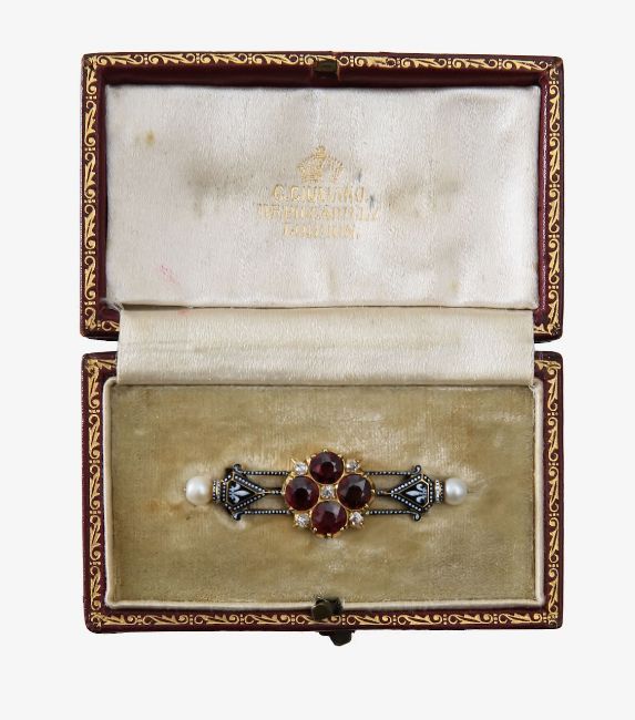 A cased Carlo Giuliano garnet, diamond, enamel and pearl brooch