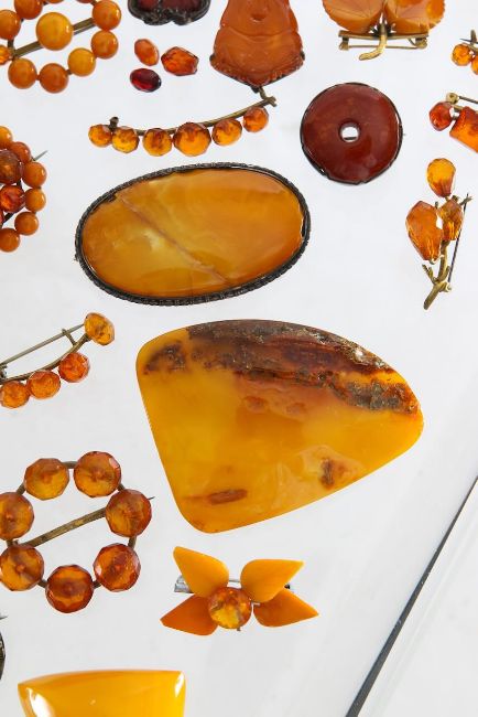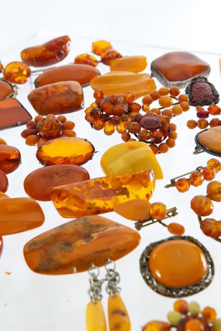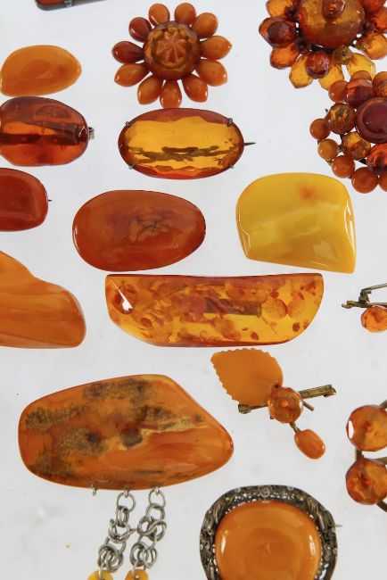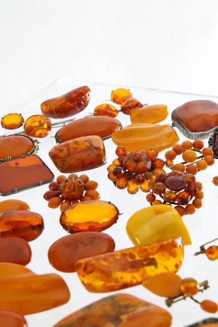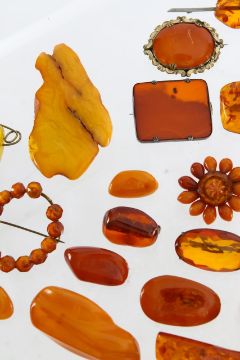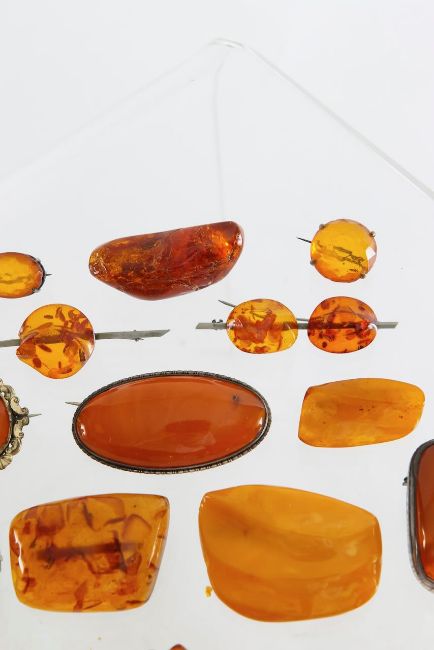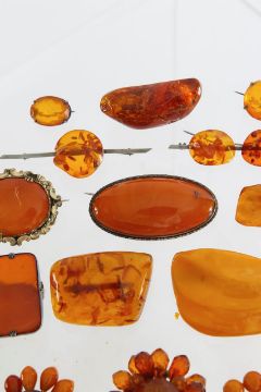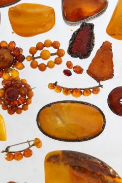 A large collection of amber brooches