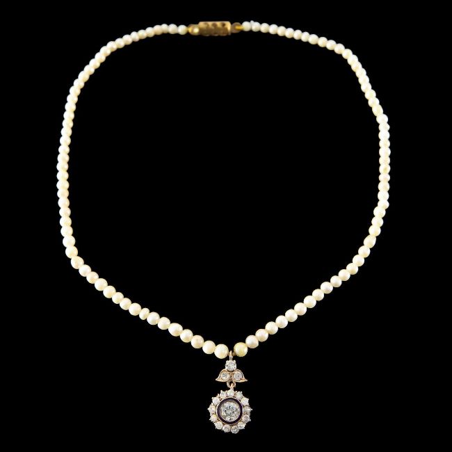 featuring a diamond set cluster pendantwith enamel detail and diamond set three stone loop suspended from an cultured pearl graduated neckl ace, non gold clasp