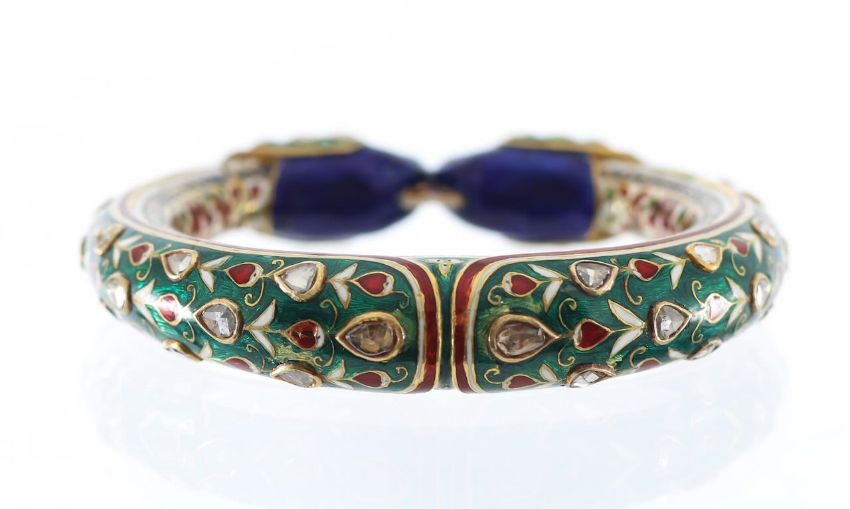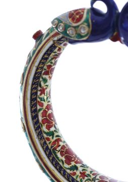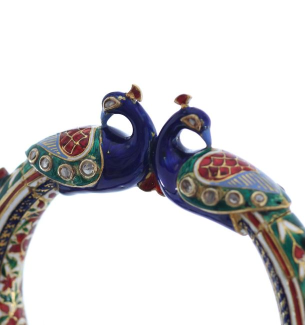 An Indian Mughal polychrome enamel 'Peacock' braceletthe colourful bangle adorned with two opposing royal blue enamel peacocks (symbolising Royalty), highly decorated throughout in vibrant polychrome enamel in symmetrical patterns set with old rose cut diamonds, with screw unlocking swivel mechanism, tests high caratDimensions: total weight approx. 99g., inner diameter 5.5cmCondition: One diamond missing from screw top. Some wear in patches to enamel. Lovely vibrant piece.