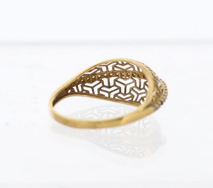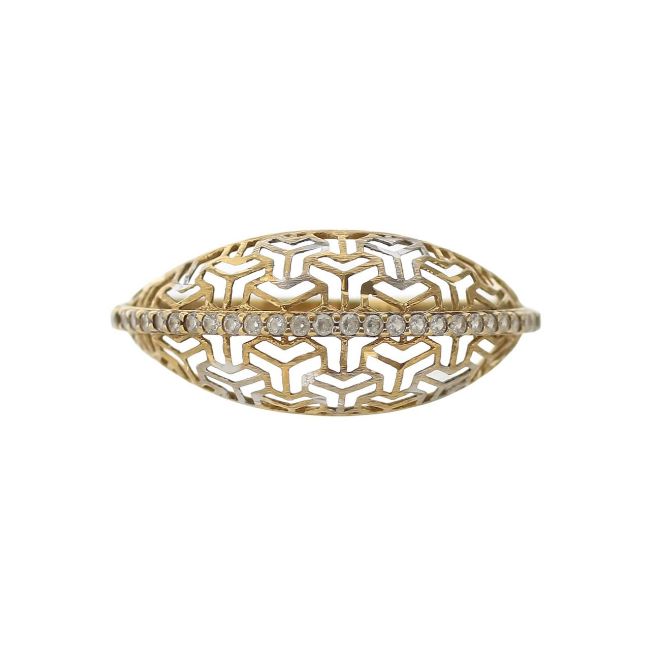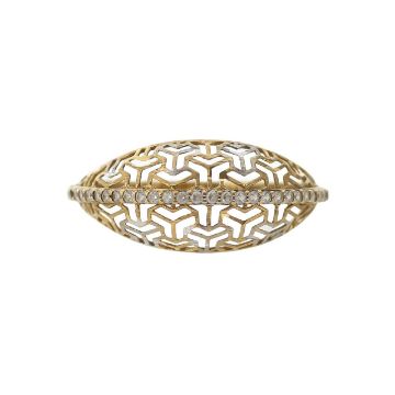 with 750 stamp, centrally set across the finger with cubic zircon stones, a modern open-work repeating pattern dome with yellow and white metal detail