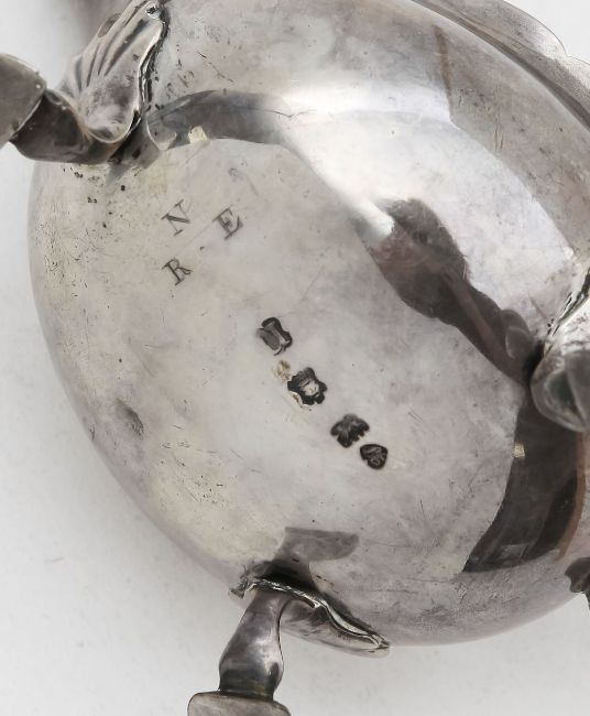 by John Pollock, London 1755, with an acanthus leaf handle, raised on three shell and hoof feet, the underside with engraved initials N.R.E