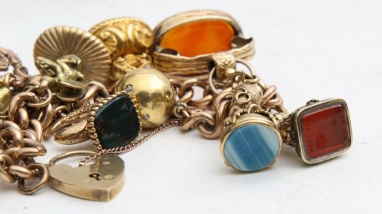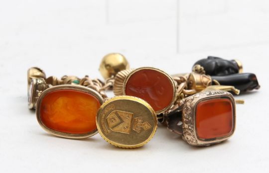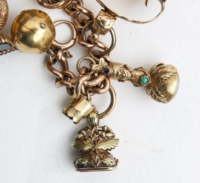 An impressive collection of fob seals and other charms bracelet