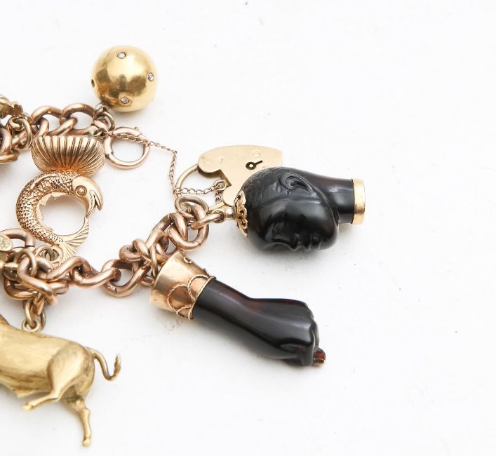 Condition: With wear commensurate to age, the bull, the shield seal fob, the ball, tested high carat, the black more stamp 14ct, one fob tested non gold, bracelet stamped 375,