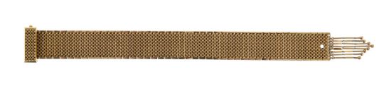 stamped 18ct import mark, an articulated Italian style engineered bracelet, with a box clasp and figure eight safety catch, 'V' shaped tassel and bead detail (one deficient)