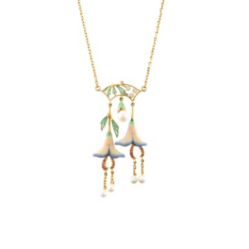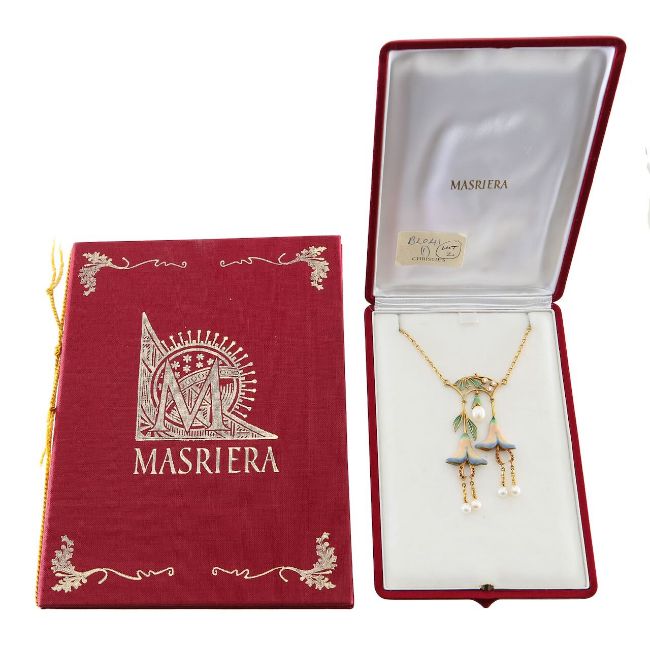 the polychrome enamel bell-shaped flowers with drops set with rubies and twin cultured pearl drops, suspended from an openwork plaque of green plique á jour enamel leaves with brilliant-cut diamond accents, to single cultured pearl bud and plique á jour enamel leaf detail, with fine link neck chain, stamped on the catch 750, in makers case and accompanied by certificate of authenticity No. A-3593-A, signed Masriera and No. A3593A