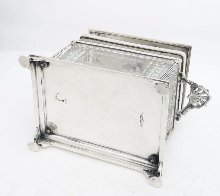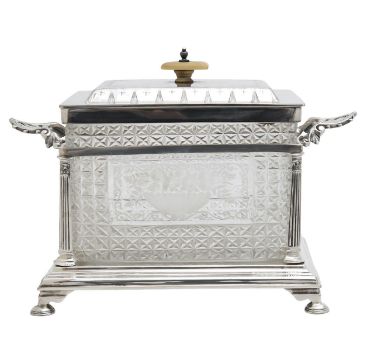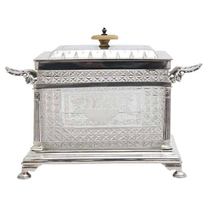 the rectangular silver plated and cut glass box, with an ivorine finial, and etched with a flower laden vase, raised on a silver plated mount, with Corinthian column supports
