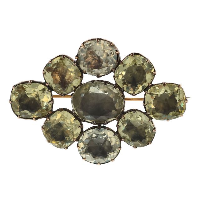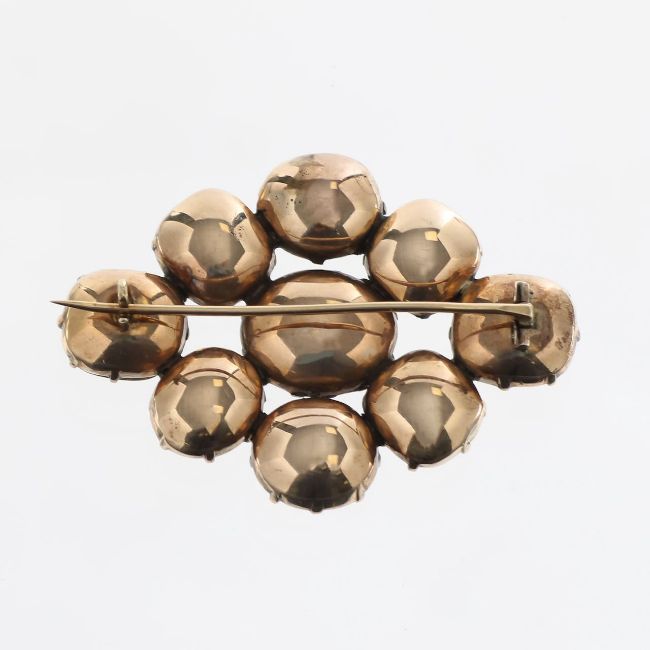 A early Victorian gem stone broochwith nine large mixed cut citrines held in a closed backed Victorian cut down setting mounted in a diamond shape with brooch pin and 'C' claspDimensions: weight 23.7gwidth 5.5cm height 4cmCondition: Tested as gold, with wear commensurate to age, some facet edge wear