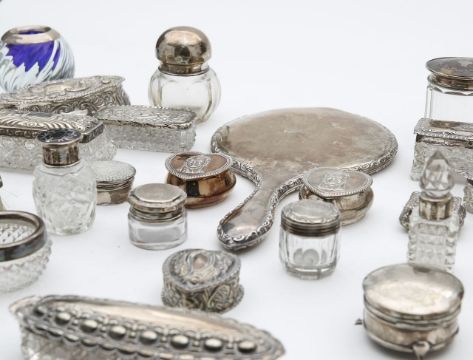 to include a mirror, two brushes, nineteen silver lidded and cut glass boxes, jars and perfume bottles, of varying form, with repoussé, engraved decoration or tortoiseshell inlaid, and seven silver boxes, including a ring box, a shagreen inset box, and two heart-shaped examples, and a small tray (Qty.)