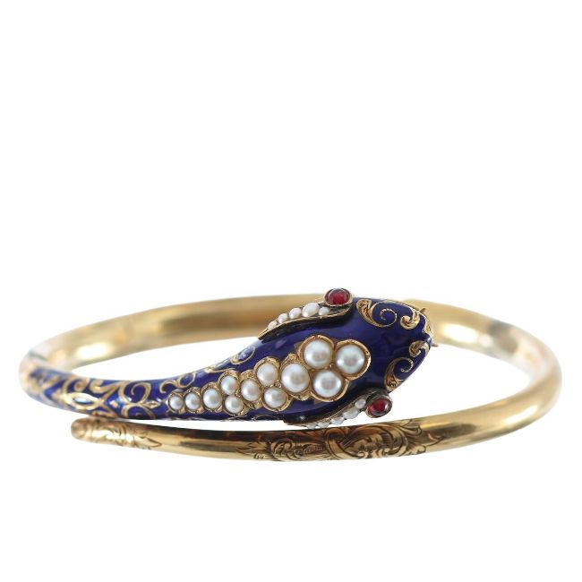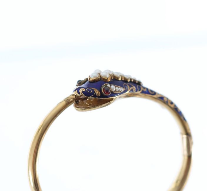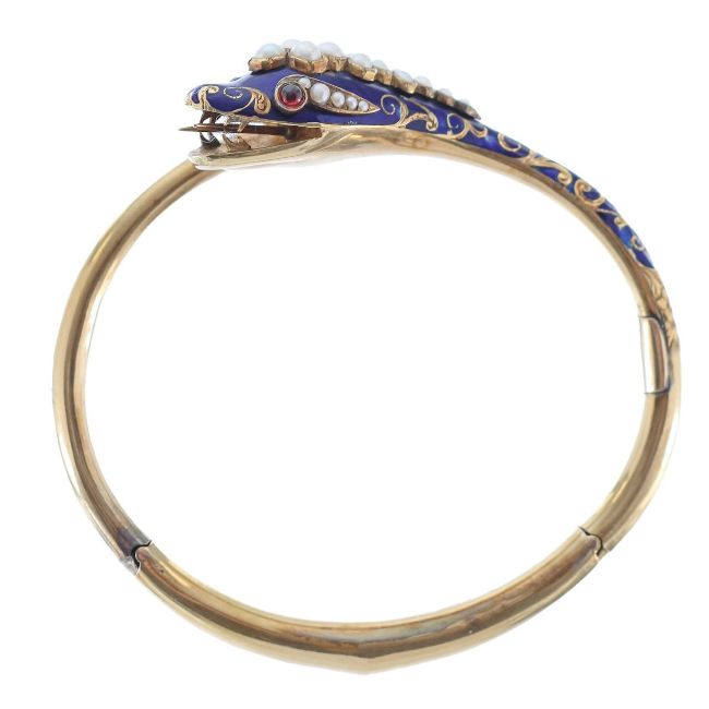 the sprung bangle modelled as a snake with blue enamelled head set with cabochon red gem eyes, and half pearl scroll details, with engraved floral detail to the tail