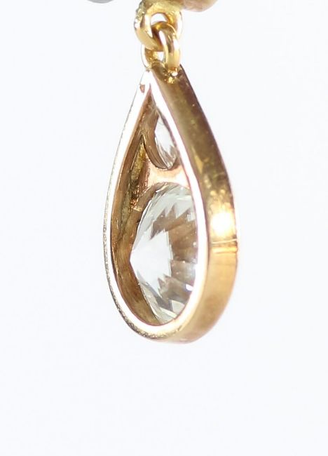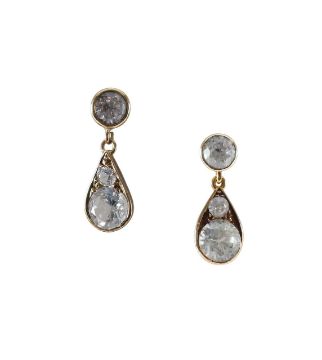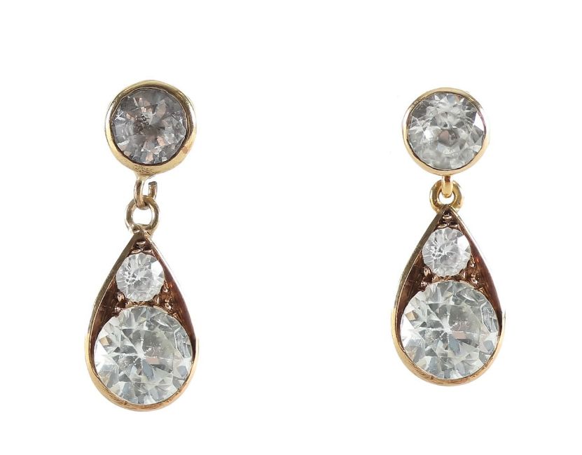 A pair of pendant ear dropsset with faceted white zircon gem stones in a tear shaped pendulum suspended from a single zircon stud with peg and scroll fixings in fitted boxDimensions: weight 3g length 2cmCondition:With wear commensurate to age, tested as gold, one ear ring seems to have been replaced, the original has three white zircon stones, with wear to the facet edges, the second replacement ear ring has very little wear, the white stones, have not been determined, it is slightly larger then the original
