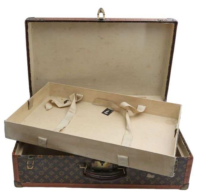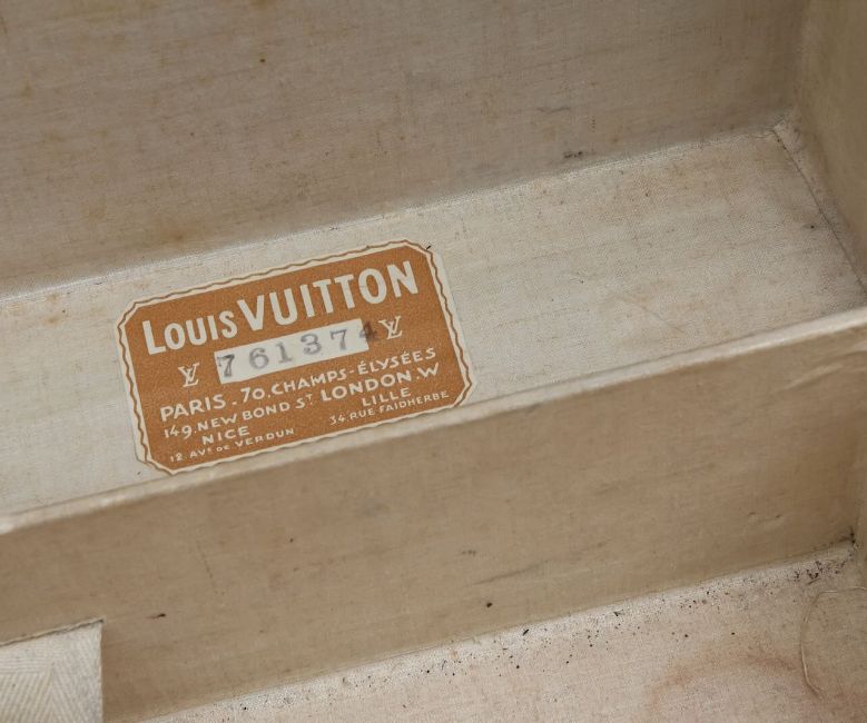 A canvas-lined interior with removable trunk tray and straps, stitched Louis Vuitton label baring the serial number '761374'.