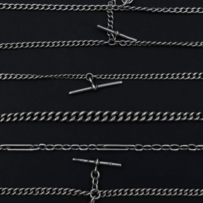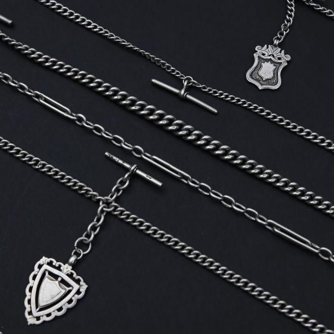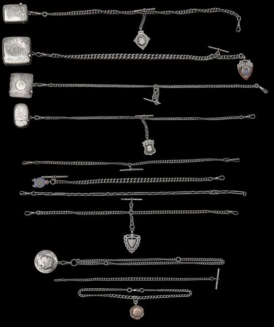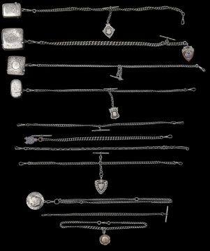 A collection of silver watch chains,
