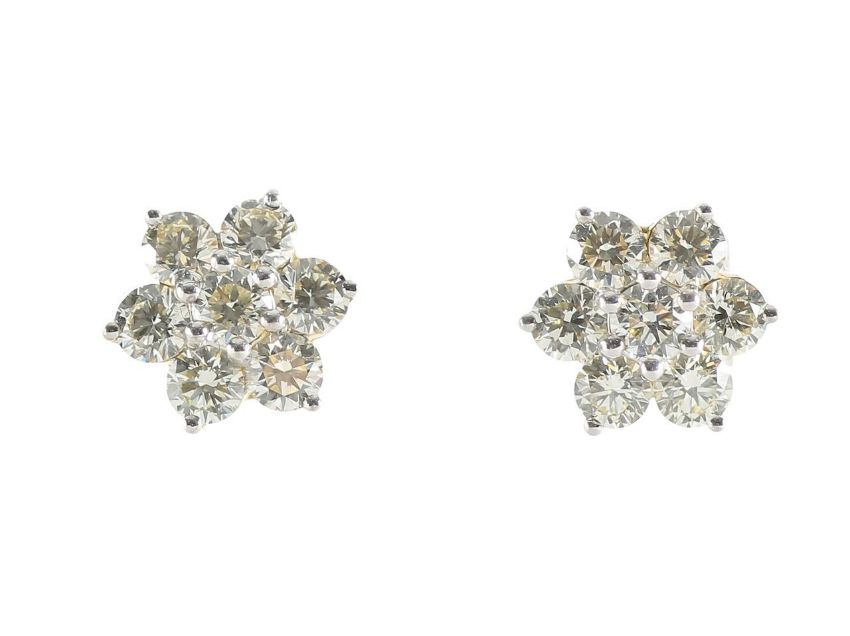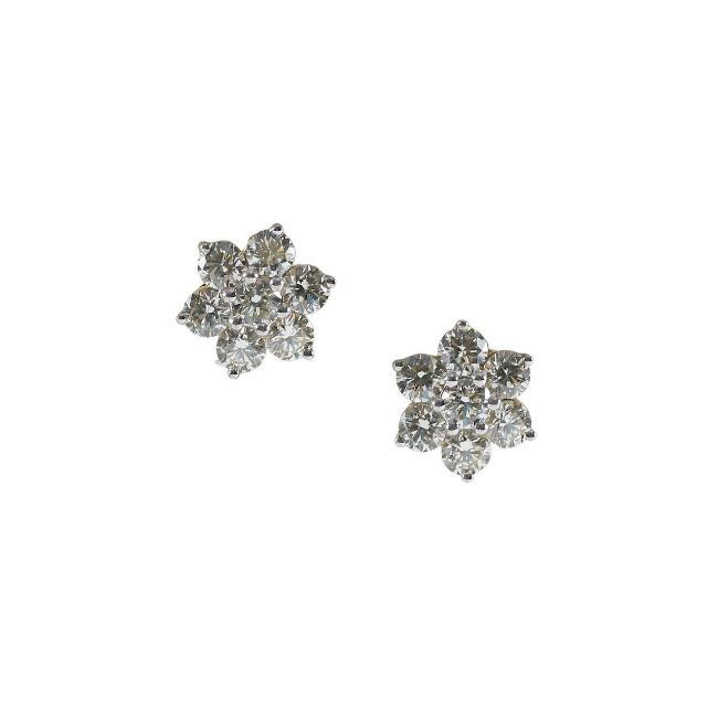 with a total of 2.42 carats of natural round brilliant cut diamonds, claw set flower cluster setting with screw back post and scroll fixings,