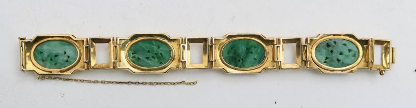 with four carved jade panels depicting flora, set within an oval portrait mount, wide rectangular links, galleried mount with a hidden, split pin clasp and safety chain
