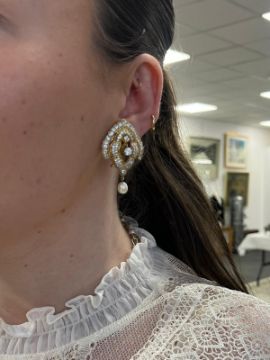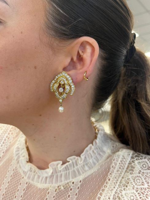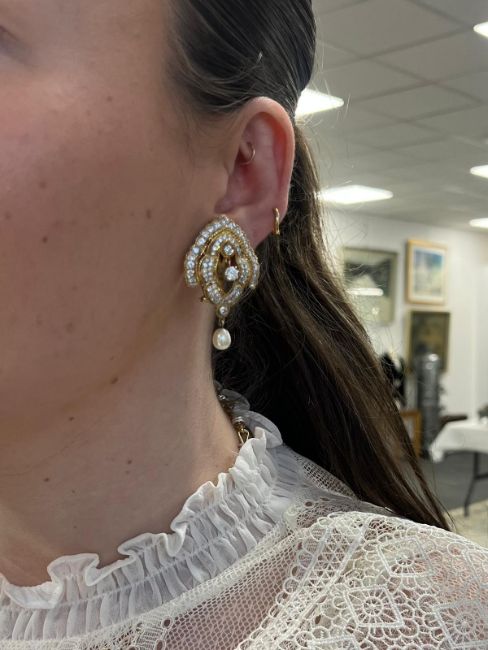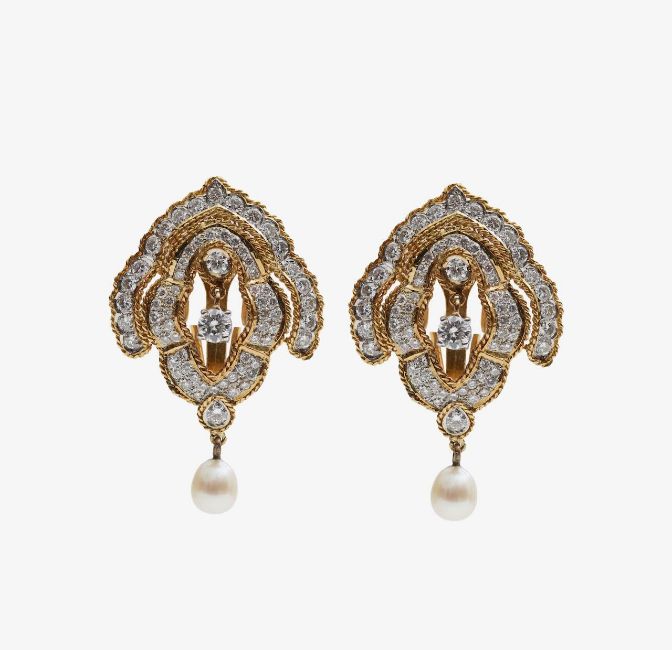 centrally set with a round articulated brilliant cut diamond, Indian design, metalwork with rope twist border grain set with brilliant cut diamonds, pearl drop (untested) with suspension loop, to the reverse a post and lever fitting