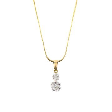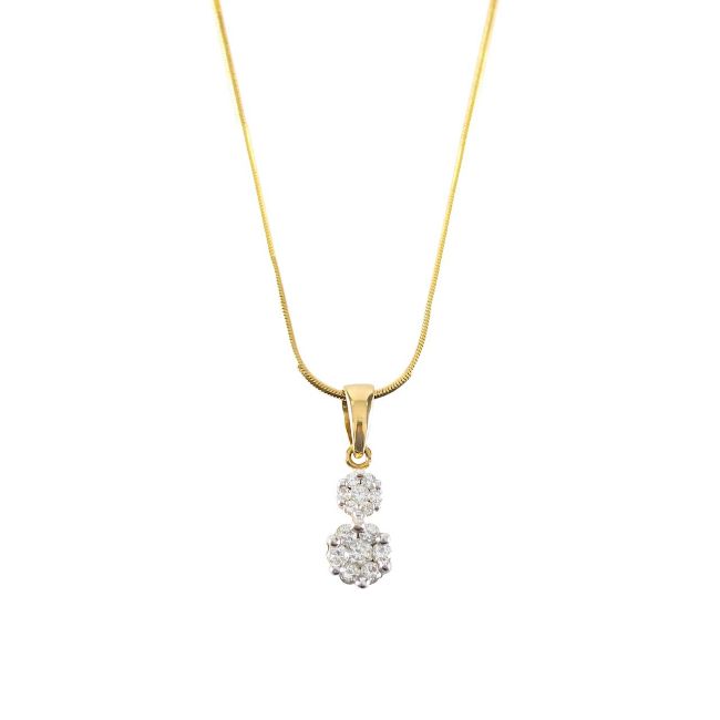 with 750 stamp, a double cluster drop pendant each set with seven round brilliant cut diamonds suspended from a fine snake link chain