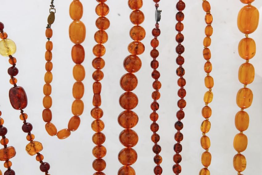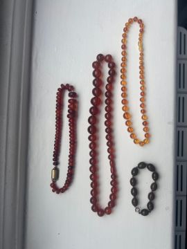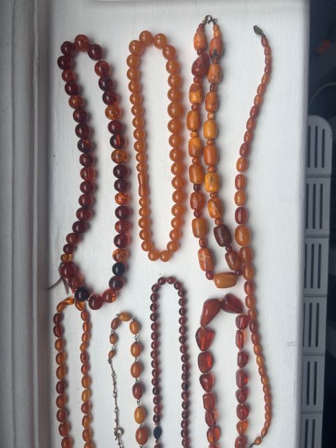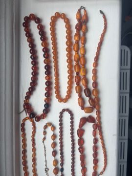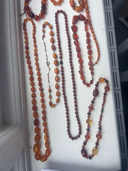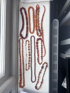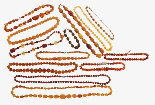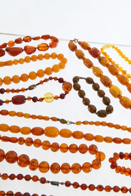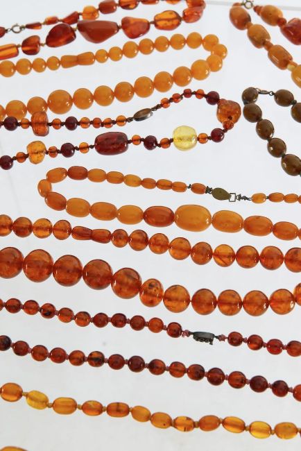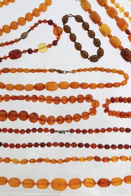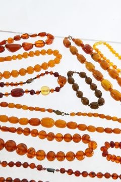 Of various colours; butterscotch, honey, cognac, cherry, etc., and shapes including round, oval and faceted. Mainly strung knotted with integral or white/yellow metal clasps. Together with a brown/green amber bracelet. (qty)