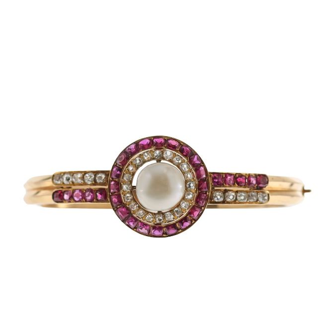 centrally set with a natural saltwater button pearl, surrounded by a halo of old mine cut diamonds in a cut down setting and calibrated old cut rubies in a thread and grain setting mounted on a wire- work collet, a double row bangle featuring grain set diamonds and rubies, with an invisible hinge mechanism and snap clasp, with French poinçon, with GCS verbal report for pearl from GCS lab confirming Natural Saltwater