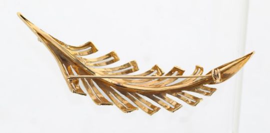 A gold stylised feather lapel brooch