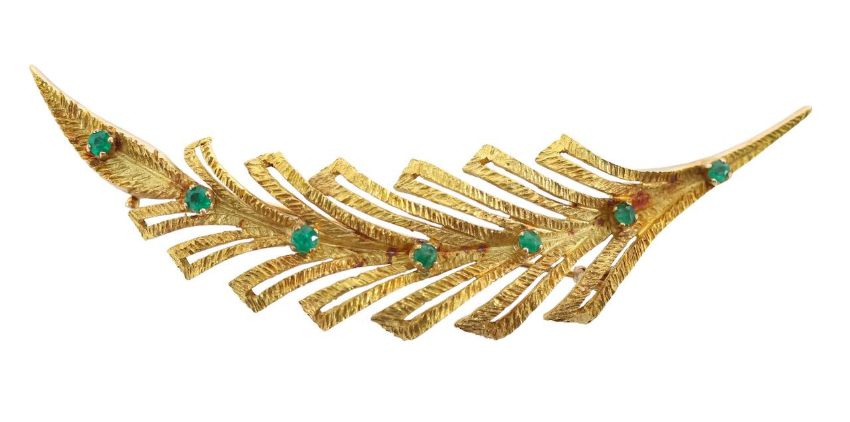 with 750 stamp, heavily textured geometric feather brooch set with seven round mixed cut emerald stones to the centre, with brooch pin clasp