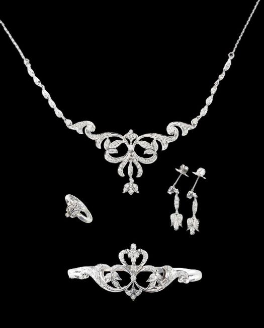 comprising of matching ring, necklace, pendant earrings and bangle, with foliated pattern set with brilliant cut diamonds to a silver setting (4)