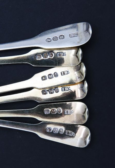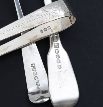 comprising a set of five gilt Fiddle pattern grapefruit spoons, maker IB, London 1807, a Fiddle pattern ladle, by George White, Glasgow 1825, with engraved initials, a similar teaspoon by Thomas Austin, London 1819, Fiddle and Thread pattern fork, by Richard Crossley & George Smith IV, London 1810, and a pair of bright-cut engraved sugar tongs, London 1803 (9)