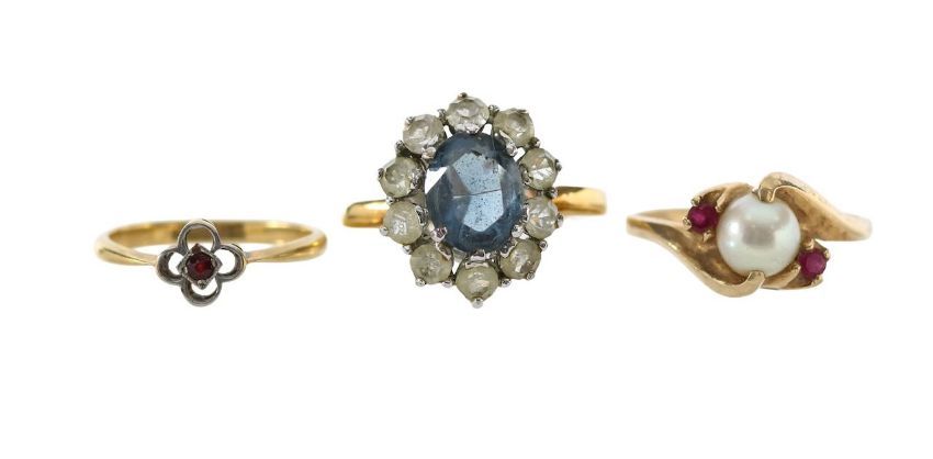 featuring a cross over pearl set ring with ruby set shoulder and indistinct hallmark together with a garnet set daisy ring with 18ct stamp (2)