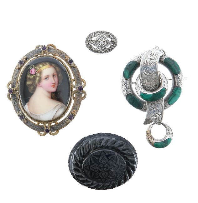including a silver Scottish brooch in the form of a buckle with scroll work engraving and inlayed with malachite, pin clasp to rev, a portrait of a young lady wearing a rose in her hair, painted on shell, bezel mounted on a decorative paste set frame, an oval carved mourning brooch and an oval paste set silver to be worn on a ribbon (4)