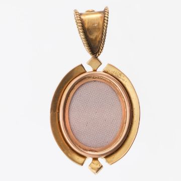 A mid Victorian Etruscan Revival enamel, yellow gold and gem-set pendant