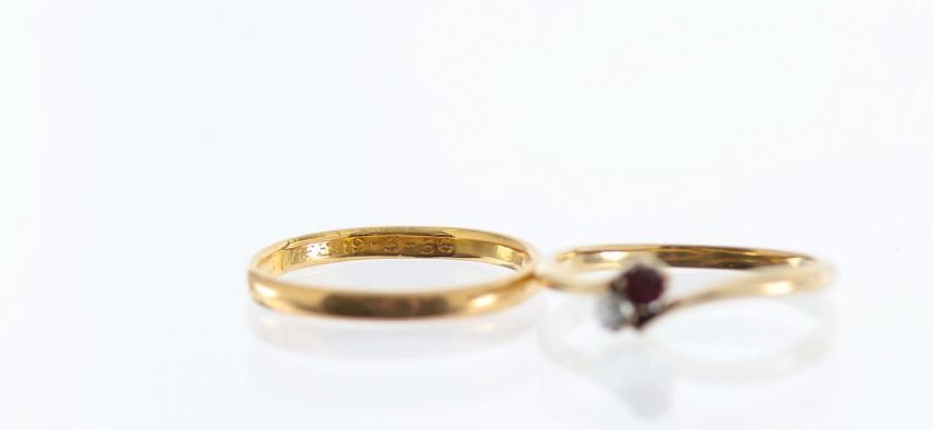 with 18ct stamp, old cut diamond and ruby 'Toi and Moi' ring set across the finger and a 1954-55 London hallmark wedding band